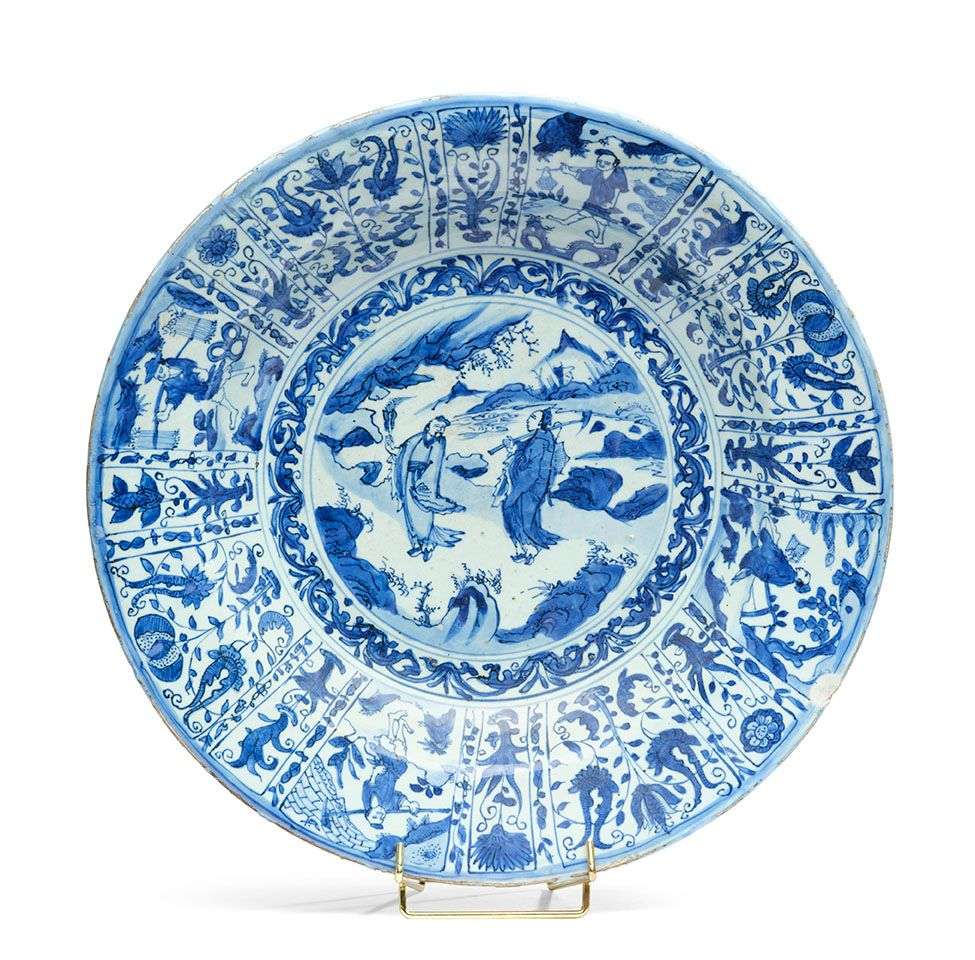 Important plat en porcelaine bleu-blanc de type « kraak » à décor de personnages et tulipes. Étiquette au dos.
