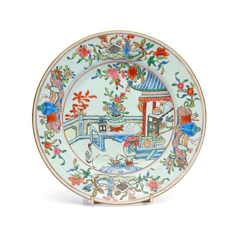 Assiette en porcelaine de la famille rose à décor de grue entourée de « Cent Antiques » sous un pavillon.