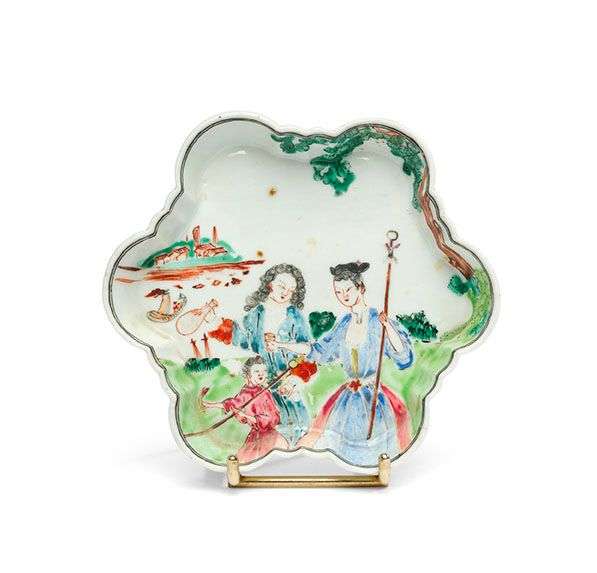 Pattipan en porcelaine de la famille rose à décor d'Européens dans un paysage lacustre.