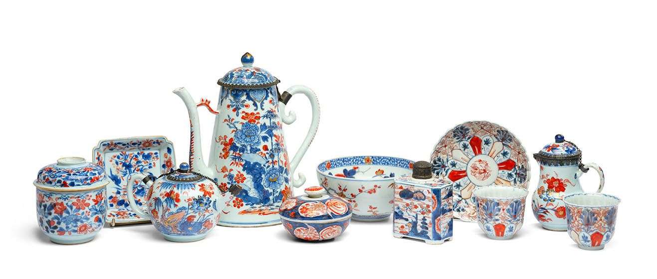 Ensemble en porcelaine à décor Imari et porcelaine surdécorée comprenant une grande verseuse couverte, un pot à lait couvert, une théière couverte, un pot à thé couvert, deux tasses polylobées, un pot couvert, un petit plat carré et un plat en forme de chrysanthème. Tailles et décors variés.