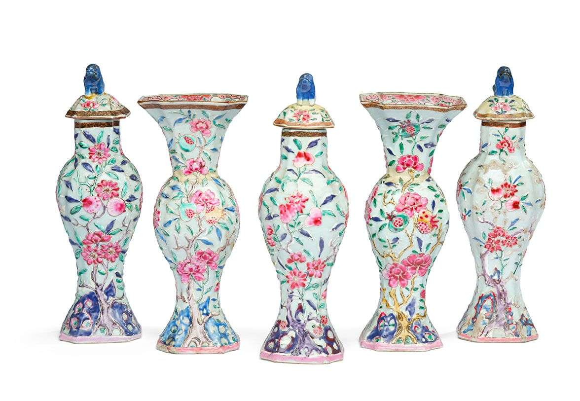 Ensemble de trois vases balustres couverts et deux vases cornets en porcelaine de la famille rose à décor moulé de pêches, grenades et pivoines.
