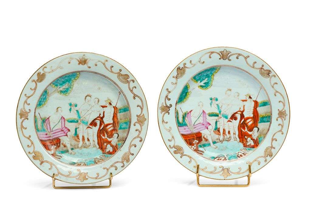 Deux assiettes en porcelaine de la famille rose et rehauts d'or à décor du « Jugement de Pâris ». Le prince troyen représenté assis donnant la pomme d'or à Vénus, debout accompagnée de Minerve et Junon. Le bord de l'aile avec une frise de rinceaux.