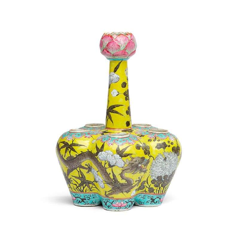 Tulipière en porcelaine aux émaux polychromes décorée en grisaille sur fond jaune de dragons parmi les chrysanthèmes, pivoines et hibiscus. Le haut du col à l'imitation d'un bouton de lotus.