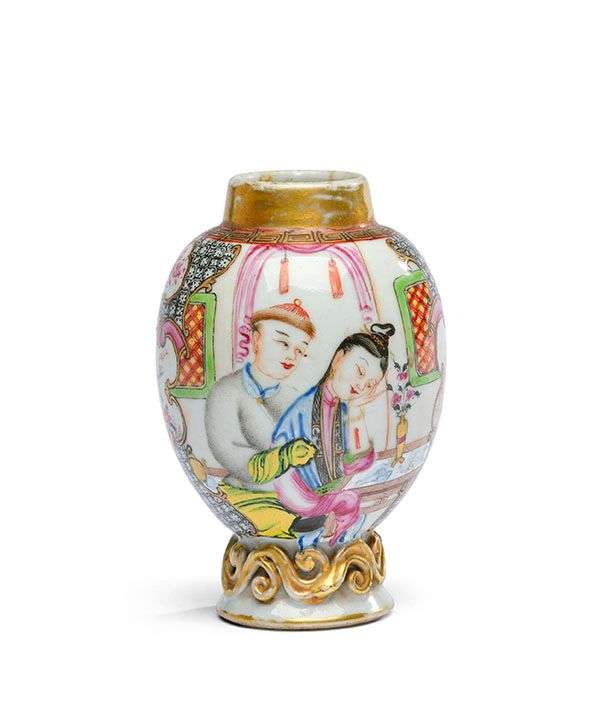 Pot à thé en porcelaine de la famille rose à décor de deux réserves avec un couple et deux petites réserves avec des oiseaux.
