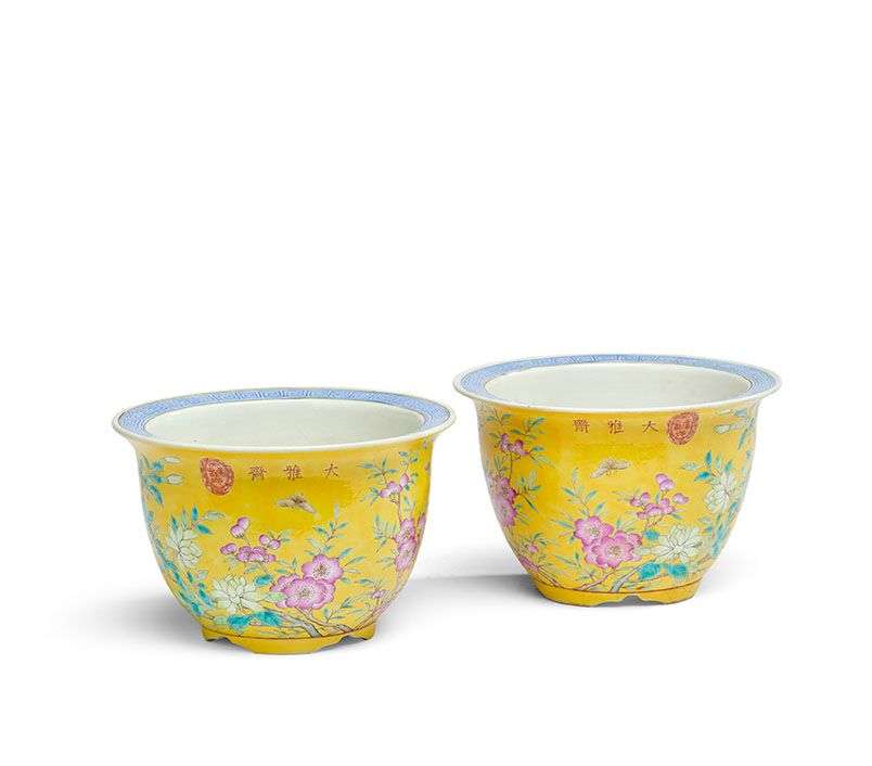 Paire de jardinières en porcelaine aux émaux de la famille rose sur fond jaune à décor de papillons parmi les prunus et les magnolias. Une marque Dayazhai en rouge-de-fer et un cachet ovale avec deux dragons encerclant des caractères en partie supérieure de la panse.