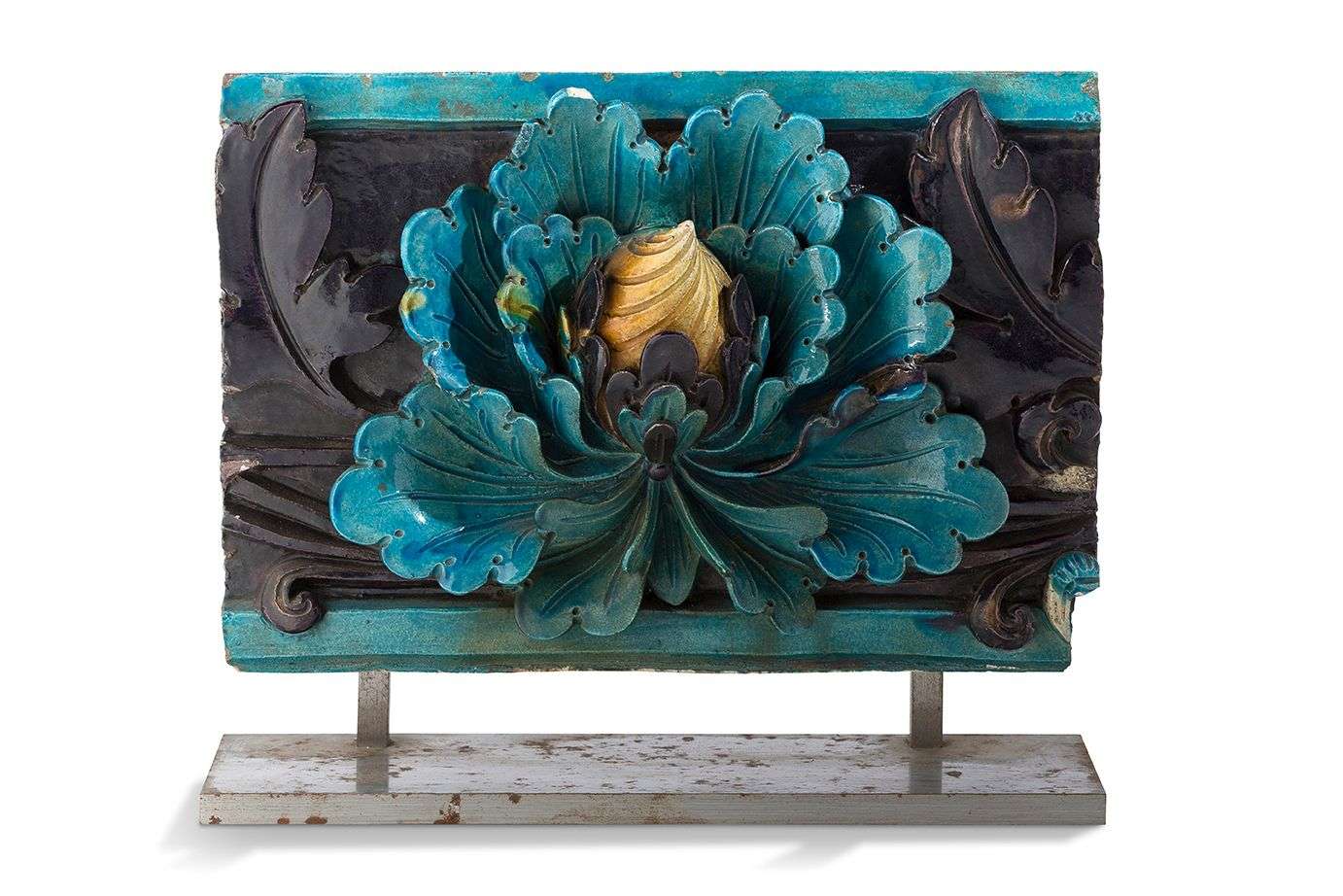 Ornement architectural en grès Fahua figurant une large pivoine épanouie sur fond de rinceaux. Sur un socle en métal argenté postérieur.