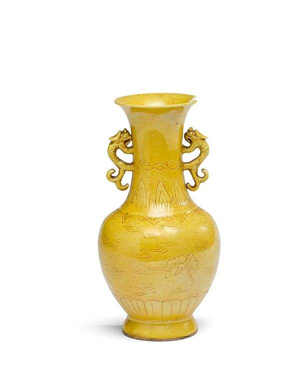 Vase bouteille en porcelaine à couverte monochrome jaune et décor incisé de chauve-souris parmi les nuées. Le col flanqué de deux anses en forme de dragons stylisés.