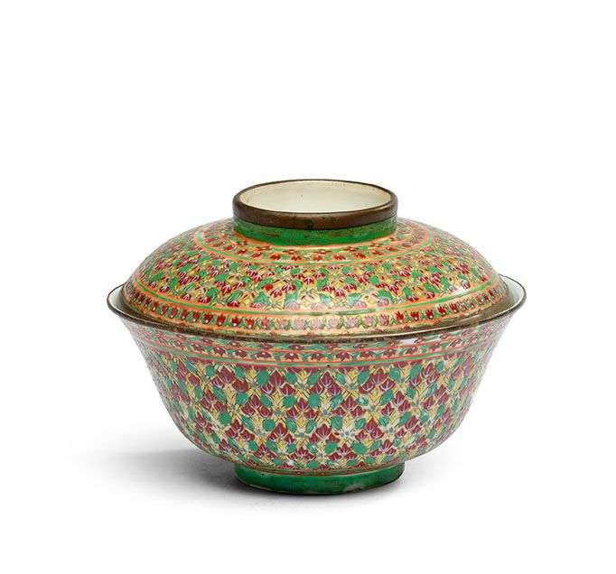 Nam Thong décoré aux émaux polychromes sur fond or de boutons de lotus « lai phum kao ». La prise du couvercle décorée d'un chrysanthème stylisé. La lèvre du bol et du couvercle cerclée de métal.