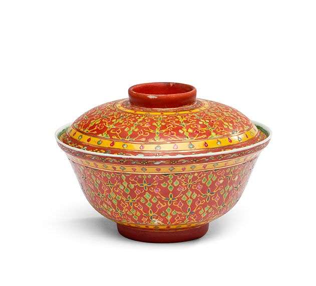 Thong décoré aux émaux polychromes sur fond brun-rouge de boutons de lotus « lai phum kao ». La prise du couvercle et l'intérieur du bol décorés d'une fleur de lotus épanouie.