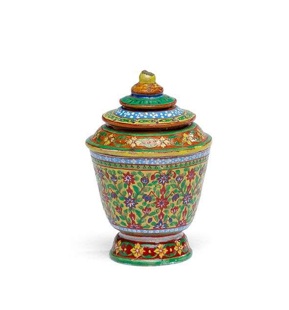 Pot couvert « toh sonh koh » en céramique émaillée polychrome à l'imitation des Bencharong décorée de motifs de « fleurs de la forêt d'Himaphan » sur fond jaune et de frises de motifs géométriques et rinceaux floraux.