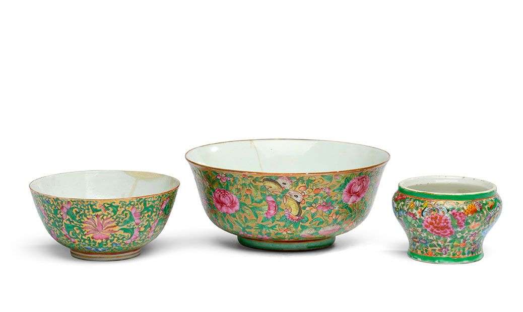 Ensemble en porcelaine Lai Nam Thong sur fond or comprenant un grand bol à décor de papillons parmi les fleurs à l'imitation des porcelaines de Canton, un bol à décor de rosace de lotus sur fond de « lai pleo », et un petit crachoir (krathomkom) à décor de papillons parmi les fleurs et les fruits.