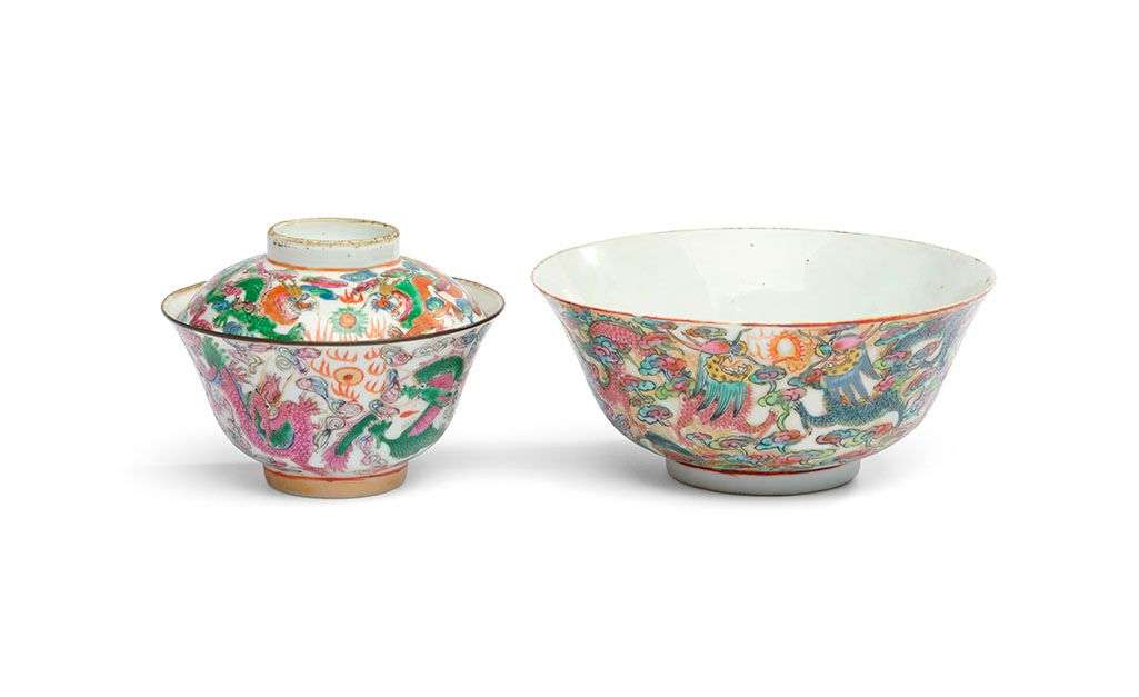 Ensemble comprenant un grand bol et un bol couvert en porcelaine Lai Nam Thong décoré aux émaux polychromes de dragons pourchassant la perle parmi les nuées, l'un sur fond or, l'autre avec une pivoine émaillée sur la prise du couvercle.