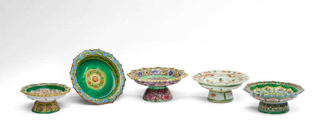 Ensemble de cinq coupes sur pied polylobées en porcelaine et faïence Bencharong et Lai Nam Thong décorées aux émaux polychromes sur fond vert, rose ou blanc de réserves, rinceaux floraux, enroulements et frises concentriques de motifs végétaux.