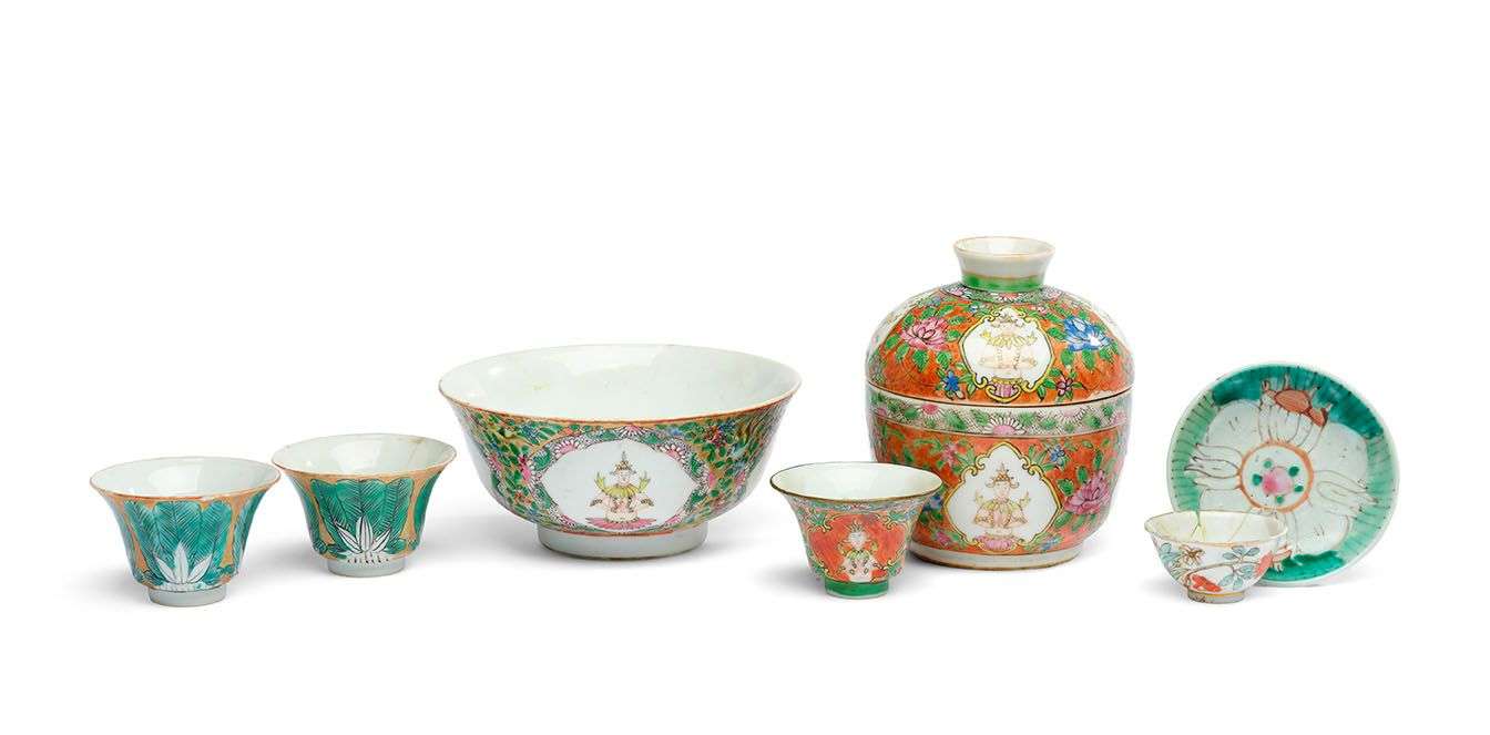 Lai Nam Thong décorées aux émaux polychromes, un bol à fond or orné de réserves avec des Theppanom (orants), un pot couvert à fond orange peint de Theppanom alternant avec des fleurs, quatre petites tasses dont deux décorées de feuilles de chou sur fond or.