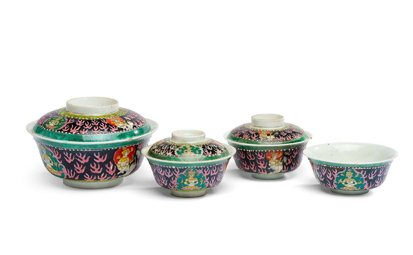 Ensemble de trois bols couverts et un bol en porcelaine Bencharong décorés aux émaux polychromes sur fond noir de flammes (kranok) avec des réserves alternées abritant des Theppanom (orants) et des Norasingha. Les bases et les couvercles avec une marque à quatre caractères en zhuanshu.