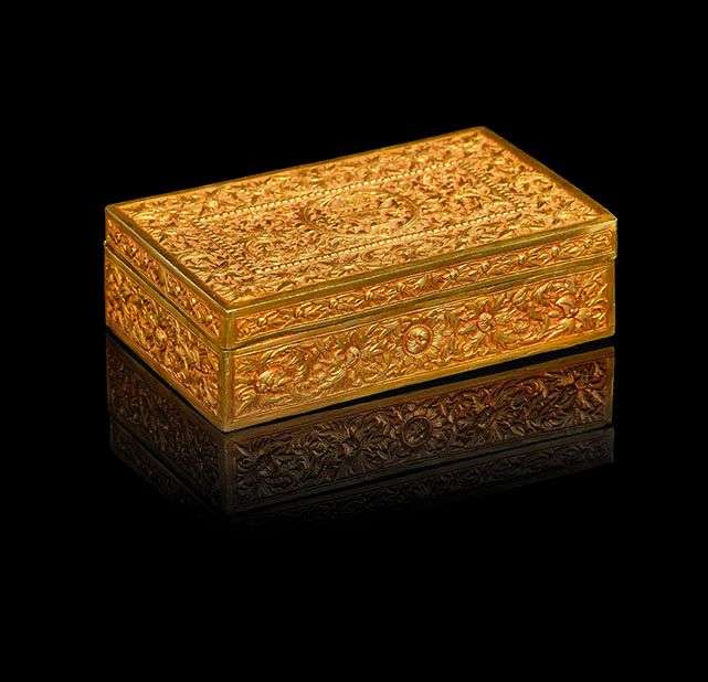 L'ensemble se détachant dans une réserve rectangulaire bordée d'une frise perlée et peuplée de rinceaux floraux. La boîte totalement ciselée de fleurettes et denses rinceaux floraux.