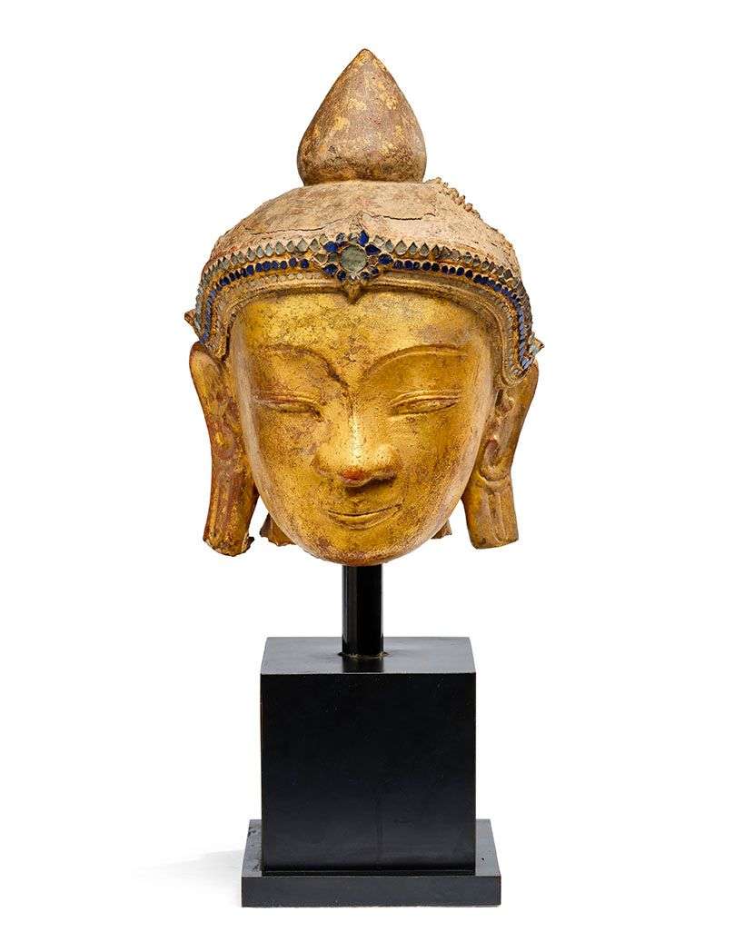 Tête de bouddha en pierre sculptée laquée or, le front ceint d'un diadème rehaussé de verroteries. Sur un socle postérieur.