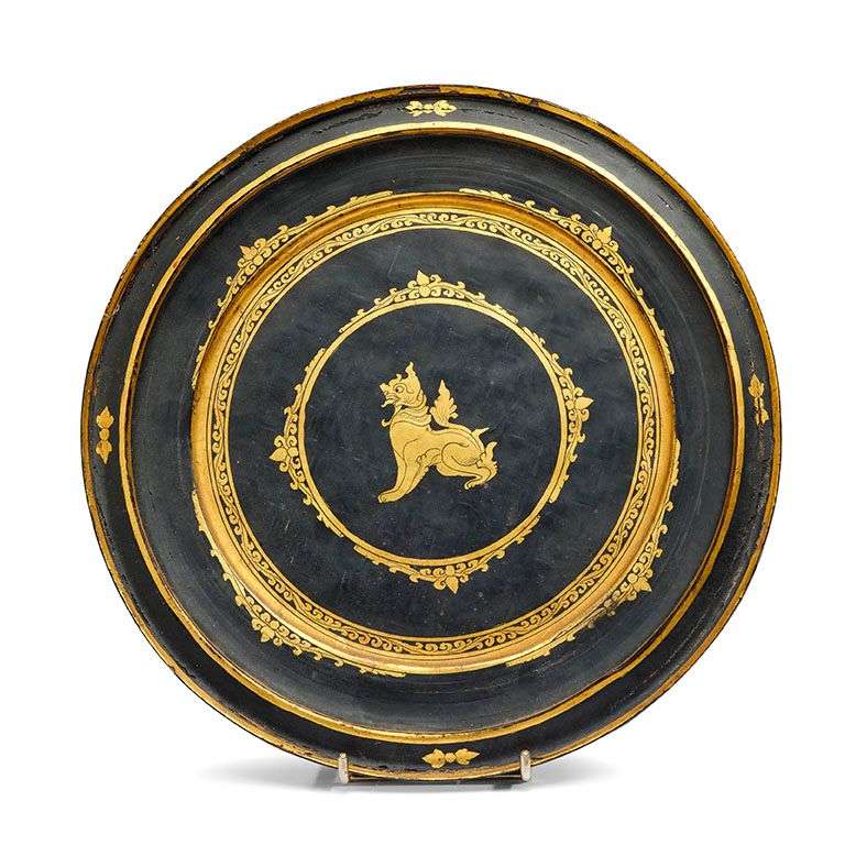 Plat circulaire en laque noir et or à décor de frises de rinceaux concentriques et singha.