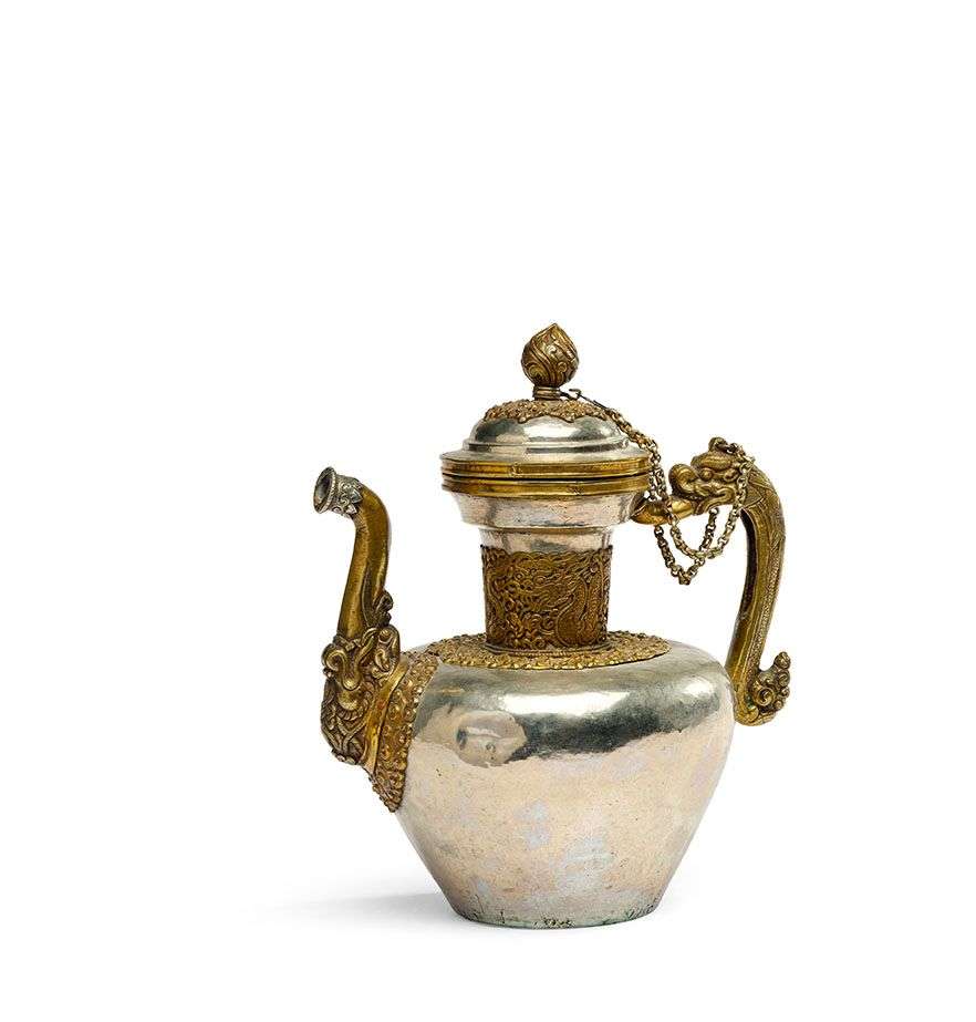 Le bec verseur en tête de makara, l'anse en forme de dragon stylisé, et la prise du couvercle imitant un bouton de lotus.