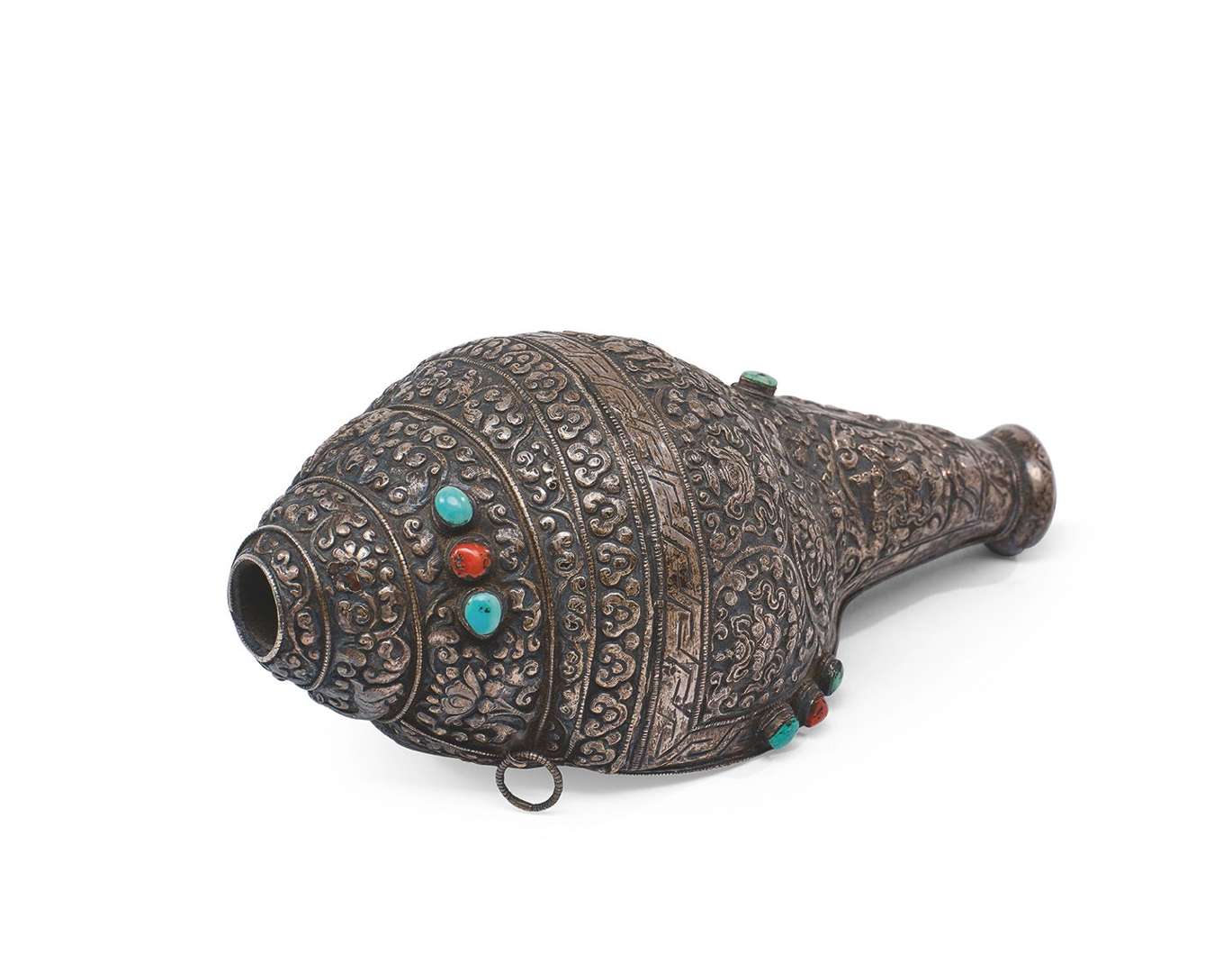 Conque cérémonielle (shanka) formée d'un coquillage avec une monture en métal argenté repoussé et cabochons corail et turquoise, décorée des Huit Emblèmes