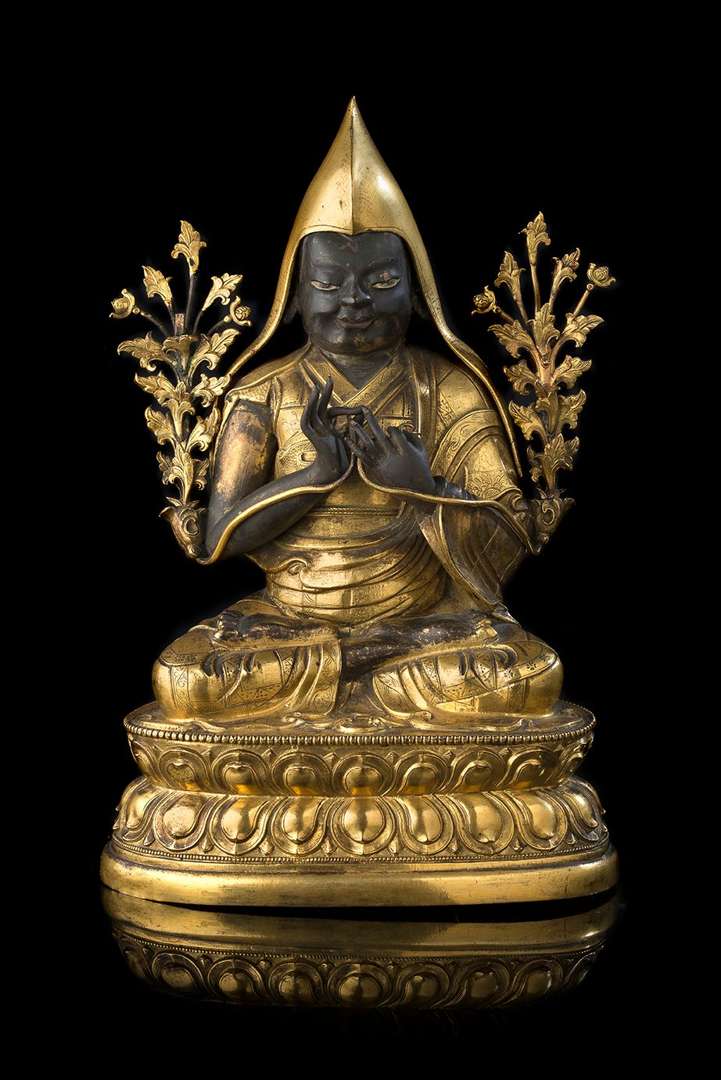 Statue de Tsongkhapa en bronze doré repoussé, assis en vajrasana sur une double base lotiforme, les mains en dharmachakra mudra et tenant des tiges de lotus s'épanouissant sur ses épaules. La robe monastique délicatement rehaussée de fines ciselures. La base scellée et incisée d'un double vajra.