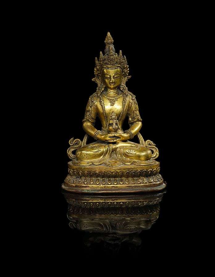 Statue du Bouddha Amitayus en bronze, assis en vajrasana sur une double base lotiforme, tenant un vase kalasha. La base scellée incisée d'un double vajra.
