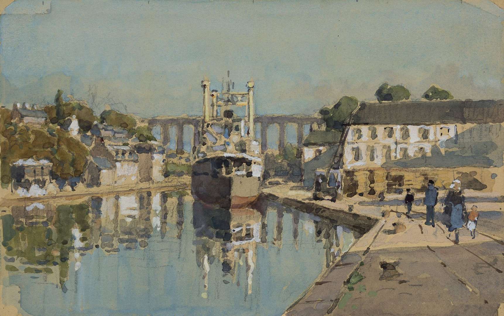 Gouache and graphite on paper, unsigned, inscribed '[...] un beau cargo suédois "Cygnus" - Vers 17h. Très beau temps/le cargo est parti comme je terminais l'ébauche' on the reverse