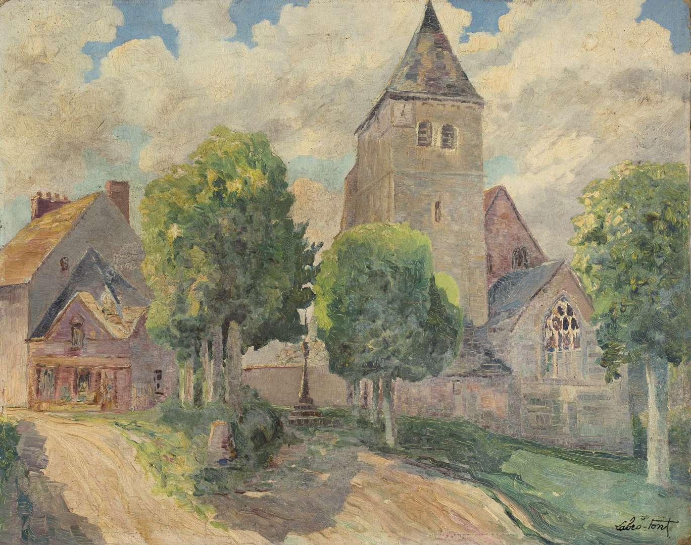 Louis Labro-Font naît à Paris en 1881. Architecte de formation et élève d’Henri Deglane à l’École des Beaux-Arts, il fréquente le milieu artistique parisien, peut-être même l’atelier de Camille Pissarro comme on le lit parfois. En 1917, on le retrouve domicilié à Ermont, à quelques kilomètres d’Argenteuil. Dans les années 1930, Labro-Font se rapproche du Vaucluse et de la Drôme, terres de ses attaches familiales. En 1938, il prête des paysages du Ventoux et de Provence au musée de Carpentras. Le livret de l’exposition est préfacé par Jean Giono et par Frédéric Mistral, neveu du grand écrivain provençal. La presse locale admire la clarté, la finesse et la simplicité de son art. En 1942, « La Croix Magazine » consacre un long article à ses œuvres, décrites comme une peinture poétique et musicale : « symphonie de couleurs, mélodie des lignes », où l’équilibre des tons et des lumières dépasse la simple représentation du paysage pour exprimer l’âme du Haut-Comtat. Installé définitivement à Valréas, Labro-Font reste fidèle à ses amitiés et à son territoire. Après la guerre, il y anime un cercle d’artistes et d’intellectuels, véritable « salon des arts et des lettres », fréquenté par des personnalités locales, musiciens et lettrés. Le 21 juillet 1952, il s’éteint à Valréas à l’âge de 71 ans. Son atelier est dispersé par Me Blache, à Versailles, au début des années 1970 et, en 1989, une monographie trilingue, co-écrite par William Ward, Gerald Shurr et Claudine Danilo, lui rend hommage.
