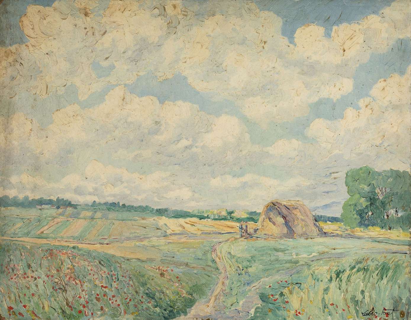 Louis Labro-Font naît à Paris en 1881. Architecte de formation et élève d’Henri Deglane à l’École des Beaux-Arts, il fréquente le milieu artistique parisien, peut-être même l’atelier de Camille Pissarro comme on le lit parfois. En 1917, on le retrouve domicilié à Ermont, à quelques kilomètres d’Argenteuil. Dans les années 1930, Labro-Font se rapproche du Vaucluse et de la Drôme, terres de ses attaches familiales. En 1938, il prête des paysages du Ventoux et de Provence au musée de Carpentras. Le livret de l’exposition est préfacé par Jean Giono et par Frédéric Mistral, neveu du grand écrivain provençal. La presse locale admire la clarté, la finesse et la simplicité de son art. En 1942, « La Croix Magazine » consacre un long article à ses œuvres, décrites comme une peinture poétique et musicale : « symphonie de couleurs, mélodie des lignes », où l’équilibre des tons et des lumières dépasse la simple représentation du paysage pour exprimer l’âme du Haut-Comtat. Installé définitivement à Valréas, Labro-Font reste fidèle à ses amitiés et à son territoire. Après la guerre, il y anime un cercle d’artistes et d’intellectuels, véritable « salon des arts et des lettres », fréquenté par des personnalités locales, musiciens et lettrés. Le 21 juillet 1952, il s’éteint à Valréas à l’âge de 71 ans. Son atelier est dispersé par Me Blache, à Versailles, au début des années 1970 et, en 1989, une monographie trilingue, co-écrite par William Ward, Gerald Shurr et Claudine Danilo, lui rend hommage.