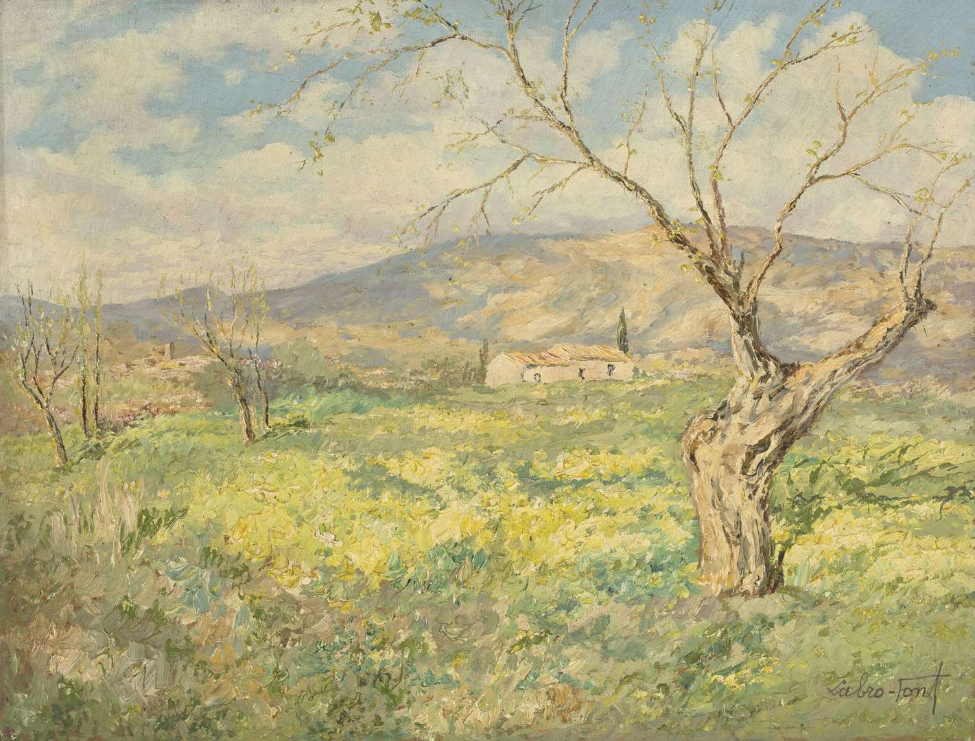 Louis Labro-Font naît à Paris en 1881. Architecte de formation et élève d’Henri Deglane à l’École des Beaux-Arts, il fréquente le milieu artistique parisien, peut-être même l’atelier de Camille Pissarro comme on le lit parfois. En 1917, on le retrouve domicilié à Ermont, à quelques kilomètres d’Argenteuil. Dans les années 1930, Labro-Font se rapproche du Vaucluse et de la Drôme, terres de ses attaches familiales. En 1938, il prête des paysages du Ventoux et de Provence au musée de Carpentras. Le livret de l’exposition est préfacé par Jean Giono et par Frédéric Mistral, neveu du grand écrivain provençal. La presse locale admire la clarté, la finesse et la simplicité de son art. En 1942, « La Croix Magazine » consacre un long article à ses œuvres, décrites comme une peinture poétique et musicale : « symphonie de couleurs, mélodie des lignes », où l’équilibre des tons et des lumières dépasse la simple représentation du paysage pour exprimer l’âme du Haut-Comtat. Installé définitivement à Valréas, Labro-Font reste fidèle à ses amitiés et à son territoire. Après la guerre, il y anime un cercle d’artistes et d’intellectuels, véritable « salon des arts et des lettres », fréquenté par des personnalités locales, musiciens et lettrés. Le 21 juillet 1952, il s’éteint à Valréas à l’âge de 71 ans. Son atelier est dispersé par Me Blache, à Versailles, au début des années 1970 et, en 1989, une monographie trilingue, co-écrite par William Ward, Gerald Shurr et Claudine Danilo, lui rend hommage.