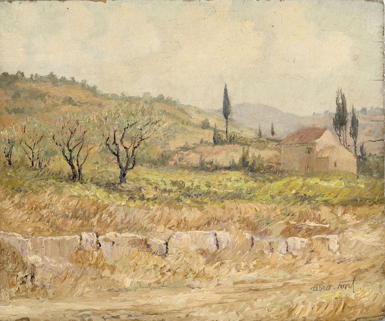 Louis Labro-Font naît à Paris en 1881. Architecte de formation et élève d’Henri Deglane à l’École des Beaux-Arts, il fréquente le milieu artistique parisien, peut-être même l’atelier de Camille Pissarro comme on le lit parfois. En 1917, on le retrouve domicilié à Ermont, à quelques kilomètres d’Argenteuil. Dans les années 1930, Labro-Font se rapproche du Vaucluse et de la Drôme, terres de ses attaches familiales. En 1938, il prête des paysages du Ventoux et de Provence au musée de Carpentras. Le livret de l’exposition est préfacé par Jean Giono et par Frédéric Mistral, neveu du grand écrivain provençal. La presse locale admire la clarté, la finesse et la simplicité de son art. En 1942, « La Croix Magazine » consacre un long article à ses œuvres, décrites comme une peinture poétique et musicale : « symphonie de couleurs, mélodie des lignes », où l’équilibre des tons et des lumières dépasse la simple représentation du paysage pour exprimer l’âme du Haut-Comtat. Installé définitivement à Valréas, Labro-Font reste fidèle à ses amitiés et à son territoire. Après la guerre, il y anime un cercle d’artistes et d’intellectuels, véritable « salon des arts et des lettres », fréquenté par des personnalités locales, musiciens et lettrés. Le 21 juillet 1952, il s’éteint à Valréas à l’âge de 71 ans. Son atelier est dispersé par Me Blache, à Versailles, au début des années 1970 et, en 1989, une monographie trilingue, co-écrite par William Ward, Gerald Shurr et Claudine Danilo, lui rend hommage.