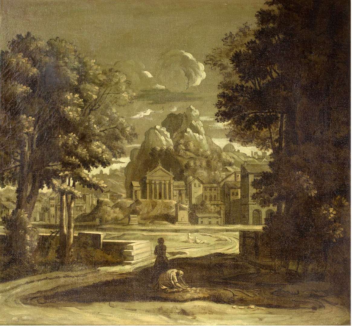 Le Paysage avec les cendre de Phocion s'inspire de l'original peint en 1648 par Nicolas Poussin (1594-1665) et conservé à la Walker Art Gallery de Liverpool (inv. WAG 10350).