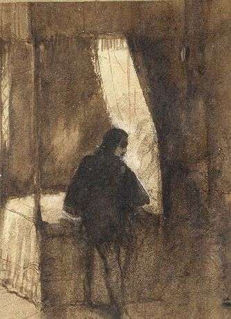 Two troubadour scenes, pen, black and brown ink, brown wash