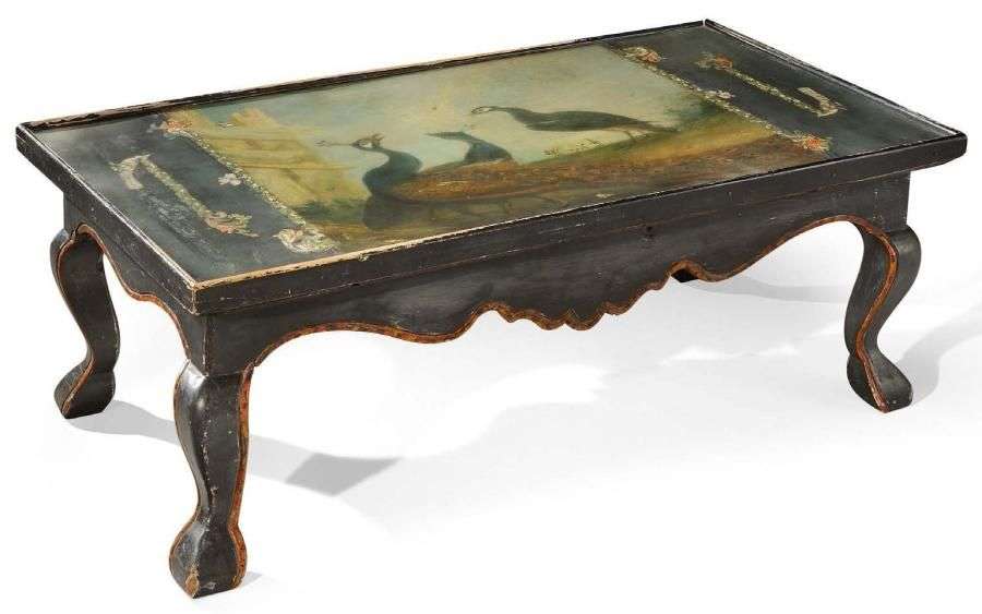 Table basse rectangulaire en bois noirci et teinté. Traverse chantournée et pieds cambrés. Plateau orné d'une huile sur toile représentant des paons sous verre. XVIIIème siècle H: 37.5 - L: 100 - P: 55.5 cm