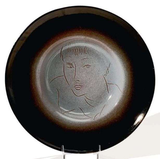 Assiette circulaire en faience émaillée noire Datée 1957 D: 30 cm