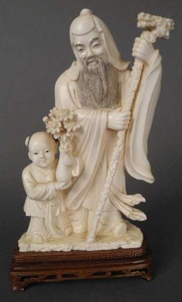 Sujet en ivoire sculpté représentant un vieil homme et un enfant Sur socle en bois Début XXème siècle H (hors socle): 19,5 cm