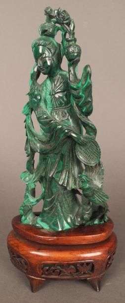 Sujet en lapis représentant une femme debout portant un vase fleuri Sur socle en bois H (hors socle): 17 cm