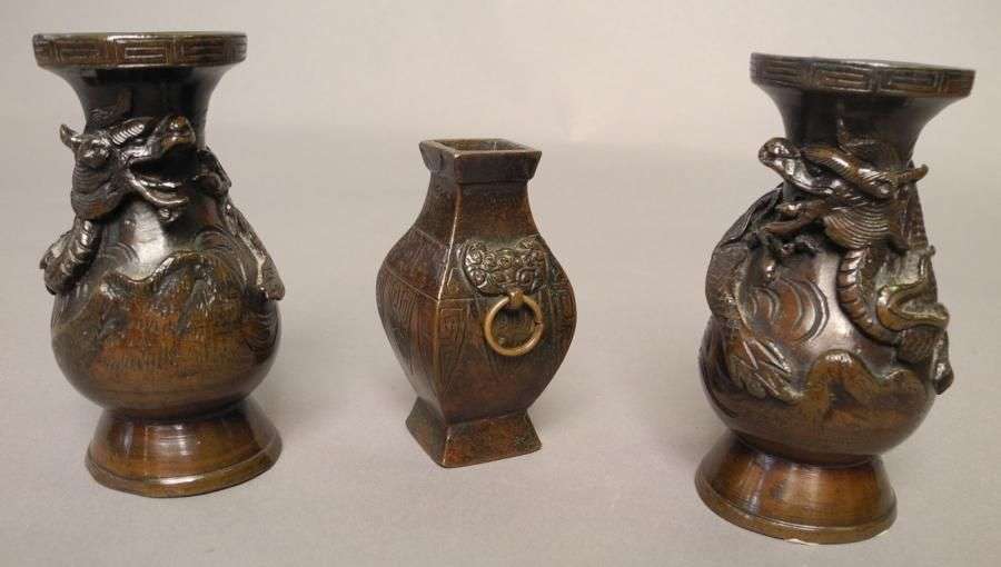 Paire de vases de forme archaique On y joint un troisième Bronze H: 7,5 et 10 cm