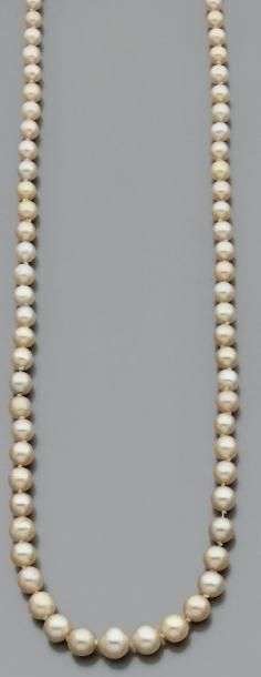Collier de 77 perles fines en chute. Fermoir baton serti de diamants de ta