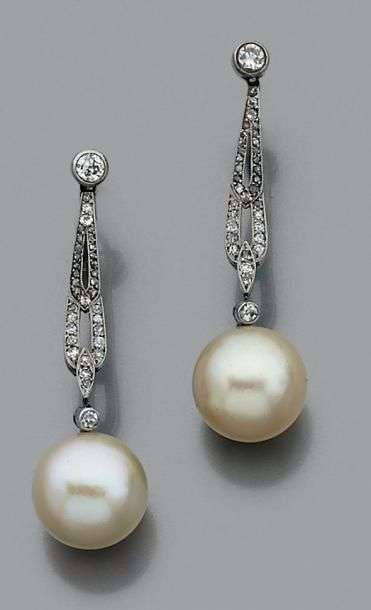 Paire de pendants d'oreilles en platine composés d'une chute de brillants retenant en pampille une perle fine. Long: env 3.9 cm Poids brut: 7.8gr Accompagnés d'un certificat du laboratoire français de gemmologie précisant perles fines. Diamètre: 10.7 - 10.8 mm