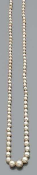 Collier de 110 perles fines rondes en chute, fermoir en or gris serti de d