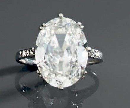 Bague en platine ornée d'un diamant de taille ancienne de forme ovale épaulé d'une petite ligne de brillants. Tour de doigt: 52 Diamant central accompagné d'un certificat du laboratoire français de gemmologie précisant: Poids du diamant: 6.48 carats Couleur: G Pureté: VS1(#)