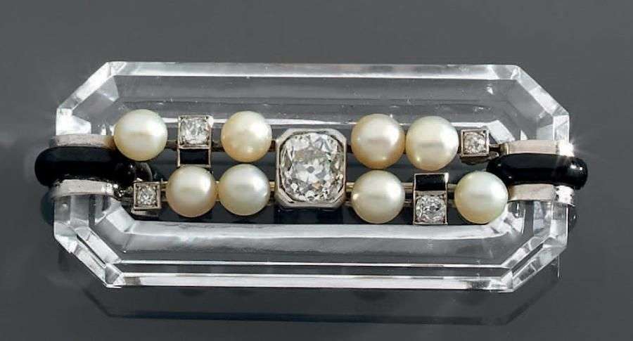 Broche rectangulaire à pans coupés en cristal de roche épaulée de deux rouleaux d'émail noir et ornée au centre d'un diamant de taille ancienne entre deux lignes de perles fines alternées de petits diamants rehaussés d'émail noir. Long: env 5.2 cm Poids brut: 17.3gr Accompagnée d'un certificat de Madame Françoise Cailles précisant vers 1920