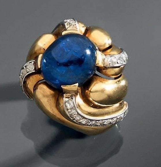 composée de sept godrons torsadés en or jaune et platine sertis au centre d'un important saphir cabochon.