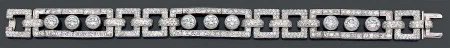 Bracelet articulé en platine et or gris composé de trois motifs rectangulaires, chacun sertis de trois diamants de taille brillant en serti clos. Ces motifs sont reliés de double liens rectangulaires plus petits, l'ensemble serti de diamants. Long: env 17.2 cm Poids brut: 38 gr