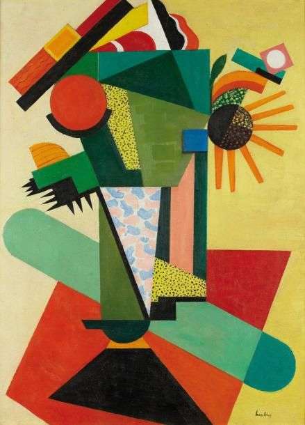 Composition, 1917 Huile sur toile, signée en bas à droite 73.5 x 54.5 cm - 29 x 211/2 in. Oil on canvas, signed lower right Cette oeuvre a fait l'objet d'un première étude au crayon et d'une seconde à l'aquarelle (qui est conservée dans les collections du musée d'Art Moderne de Paris) Un certificat n°1288 rédigé par Geneviève Claisse en date du 8 novembre 2013 sera remis à l'acquéreur Exposition: Rétrospective Herbin, Galerie Simone Heller, Paris, 1959. Référence C4 Bibliographie: Cette oeuvre sera référencée et reproduite dans le supplément du catalogue raisonné en préparation Provenance: Acquis auprès de la Galerie Simone Heller, Paris 1965 Collection privée, France Auguste Herbin débute la peinture dans le style impressionniste. En 1909, il rencontre Braque et Picasso au Bateau Lavoir et son travail s'oriente alors vers le Cubisme. Cette même année, voyageant en Corse, il découvre une lumière et une couleur qui demeureront des éléments essentiels de sa peinture. En 1910 et 1912, il participe au Salon des Indépendants et au Groupe de la Section d'Or avec Gleizes, Metzinger, Léger et Delaunay avant de réaliser ses premières oeuvres abstraites en 1917. La toile que nous présentons aujourd'hui, réalisée en 1917, et qui n'était connue que par ses travaux préparatoires, reflète des recherches d'Herbin à cette époque. Il abandonne alors le Cubisme pour se tourner vers l'Art Monumental et expérimente le réalisation d'une série d'«objets monumentaux». Dès 1922, il reviendra à un style plus figuratif avant de fonder le Groupe Abstraction-Création. Par la suite, il rédigera «l'art non figuratif, non objectif», ouvrage de référence pour ses contemporains, dans lequel il finalise son «alphabet plastique». Notre toile, exposée chez Simone Heller en 1959 et acquise suite à cette exposition par un collectionneur français, apparait après 50 ans à nouveau au grand public