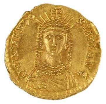 ROME LICINIA EUDOXIA ( 422 - 462 ? ). Solidus de Ravenne (vers 439) Buste drapé de face de l'impératrice portant un triple collier de perles et un diadème radié surmonté d'une croix. R/ L'impératrice nimbée, assise de face sur un trône, tenant un globe crucigère et un long sceptre cruciforme. COMOB à l'exergue et R-V dans le champ. Légende SALVS REI-PVBLICAE à césure semblant inédite. Cohen 1, Lacam vol.1 pl.V, RIC X-2023, LRC 870. De même coin de droit que l'exemplaire de Dumberton Oaks (Washington DC 1992, 870). Extrêmement rare et superbe Licinia Eudoxia, fille de l'empereur d'Orient Théodose II, naquit en 422 et épousa en 437 son cousin Valentinien III, empereur d'Occident. Cette union fut favorable au rapprochement des deux empires, mais en 455 Valentinien III fut assassiné par son chambellan, le sénateur Petronius Maximus qui accéda au trône en forçant Licinia Eudoxia, veuve de sa victime, à l'épouser. Désespérée l'impératrice appela à l'aide le roi Vandale Genséric qui marcha sur Rome et prit la ville, obligeant Petronius Maximus à fuir à cheval. Mais, durant cette fuite, l'empereur fut arrêté par une foule hostile et mis à mort après 76 jours de règne. Les vandales mirent Rome à sac pendant quinze jours et prirent en otage Licinia Eudoxia et ses deux filles qui furent emmenées en captivité à Carthage. Eudoxia recouvra la liberté sept ans plus tard grâce à une rançon payée par Léon I en 462 et finit sa vie à Constantinople ou à Rome la même année ou, selon d'autres sources, beaucoup plus tard vers 492. L'étonnant portrait de face de notre très rare solidus rend hommage à la beauté et à la majesté d'une impératrice au destin hors du commun