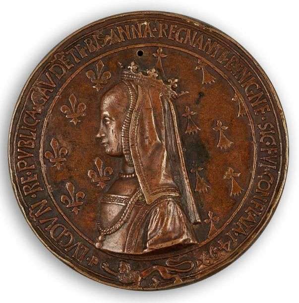 Louis XII et ANNE de BRETAGNE. Grande fonte de bronze (11,45 cm) aux bustes des époux royaux. Mazerolle II, p.9, n°27_Kress, p.100, 527. Médaille de bronze datée 1499 au buste à droite du roi sur un semis de fleur de lis. R/Buste à gauche de la reine sur un semis de fleurs de lis et d'hermines. Cette célèbre médaille fut la première d'un tel diamètre fondue en France. Conçue pour l'entrée solanelle des époux royaux à Lyon le 15 mars 1500, elle fut réalisée d'aprés un dessin de Jean Perréal par Nicolas Leclerc et Jean de Saint Priest et fondue par Jean Lepère. Un exemplaire en or, aujourd'hui disparu, fut offert à la reine et le cabinet des Médailles de la Bibliothèque Nationale, possède des exemplaires en argent, bronze et bronze doré. Par son diamètre et sa qualité, le présent exemplaire peut-être considéré comme une fonte d'époque