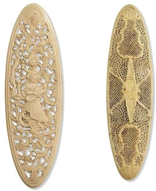 Deux éléments de navette en ivoire ajouré d'une scène galante sur un fond de feuillages, la deuxième de deux coeurs sur un fond de croisillons. XIXème Long.: 15 et 14cm Accidents