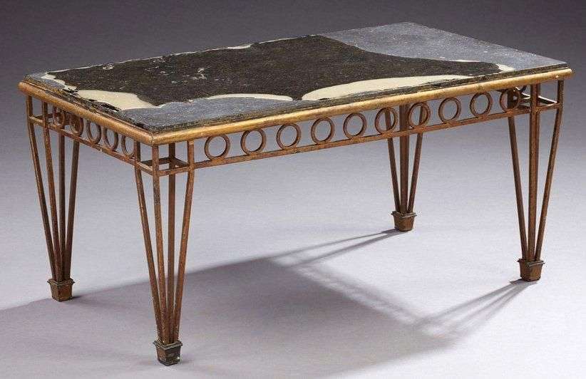 Maison RAMSAY, attribué à Table basse à plateau rectangulaire en marbre noir à structure ajourée en métal doré à décor d'une frise de disques en ceinture et reposant sur quatre pieds gainés terminés par des sabots. Vers 1950. H: 40,5 cm L: 83,5 cm P: 48,5 cm (couche de verni sur le plateau)